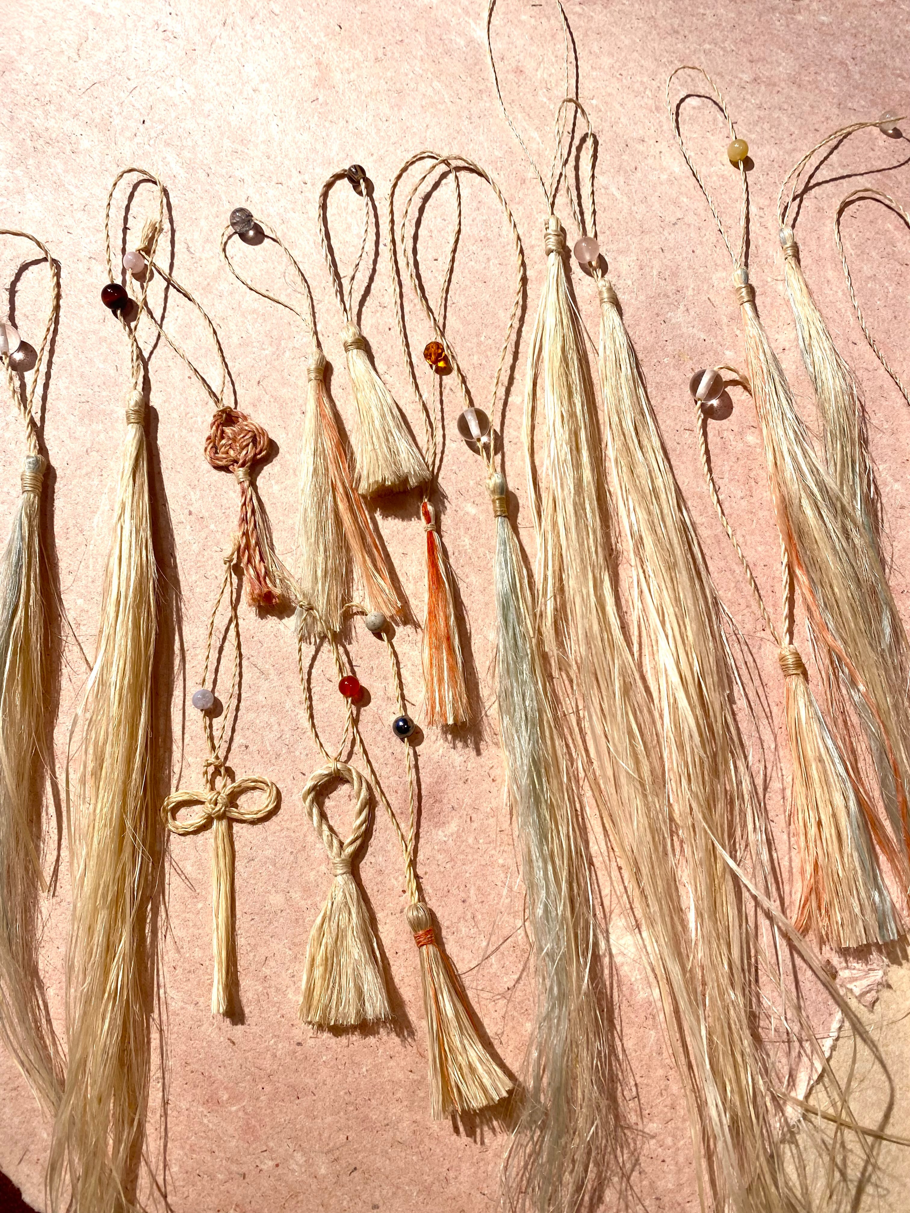 精麻お護りストラップ⭐︎8本お楽しみセット^ ^は、天然石やベンガラ染め、茜染め、藍染めの素材を使用した、ふさふさで可愛らしいストラップです。